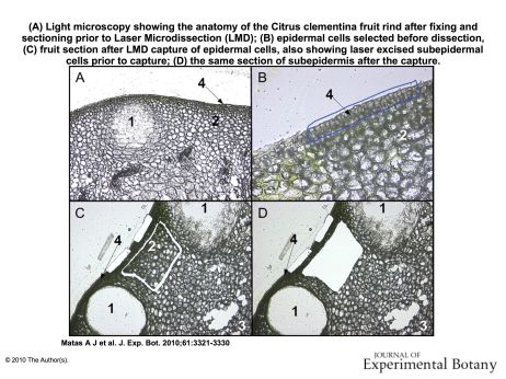 Matas, et. al. in Journal of Experimental Botany (2010; 61:3321) used Laser Microdissection to perform molecular profiling of specific citrus epidermal cell types.  During the course of their study, the Rose laboratory in the Department of Plant Biology at Cornell University also generated beautiful microscopic images showing the citrus oil glands.  You can read their paper here: “Tissue-specific transcriptome profiling of the citrus fruit epidermis and subepidermis using laser capture microdissection.”