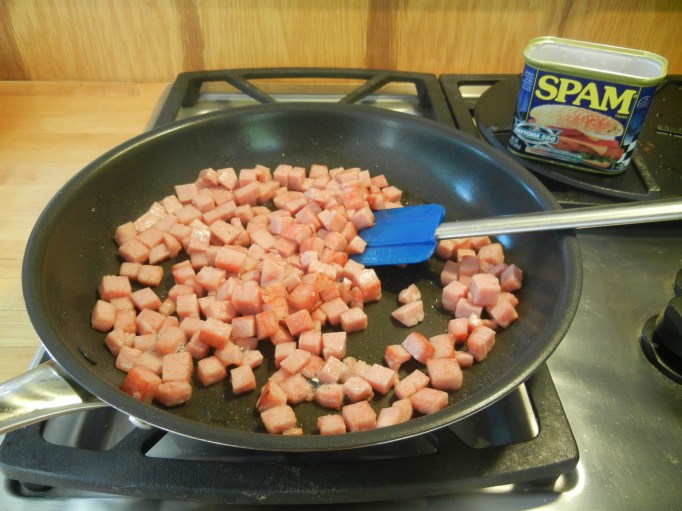 I chopped the SPAM into small chunks and fried until oil was released into the pan.  I was also surprised to learn if you fry SPAM long enough, it tastes like bacon.  Who knew?