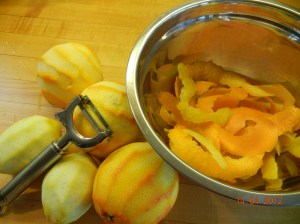 Peel the oranges and lemons using a fancy horizontal swivel peeler.  (Ok, it doesn’t have to be fancy, or even horizontal).  But the peeler I use is the mac-daddy and one of my early cocktail memories is watching Andrew Bohrer use this kind of peeler to peel an orange in one single peel and then wrap said peel around an ice sphere over which the tastiest cocktail was poured.  So I think you should really get one of these peelers.  However, whatever kind of peeler you use, try not to include the white, pithy part of the orange and lemon peels.